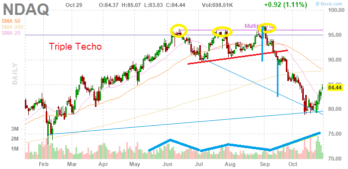 Triple techo formado este año en Nasdaq, Inc. del sector financiero, en el entorno de los 96$, con la formación de un primer techo en la primera quincena de Junio, producido después de una tendencia alcista, comienza a decrecer precio y volumen rectificando, de nuevo un incremento de volumen menor que el anterior, nos lleva a formar el segundo techo en la segunda quincena de Julio, sin superar el techo anterior, de nuevo existe una corrección por las órdenes vendedoras y por último con menor volumen, el precio asciende de nuevo hasta la resistencia formada por los dos techos anteriores, formando un tercer techo y esta vez, los vendedores logran romper la línea de soporte quedando confirmada la figura de formación de triple techo con un importante incremento de volumen.