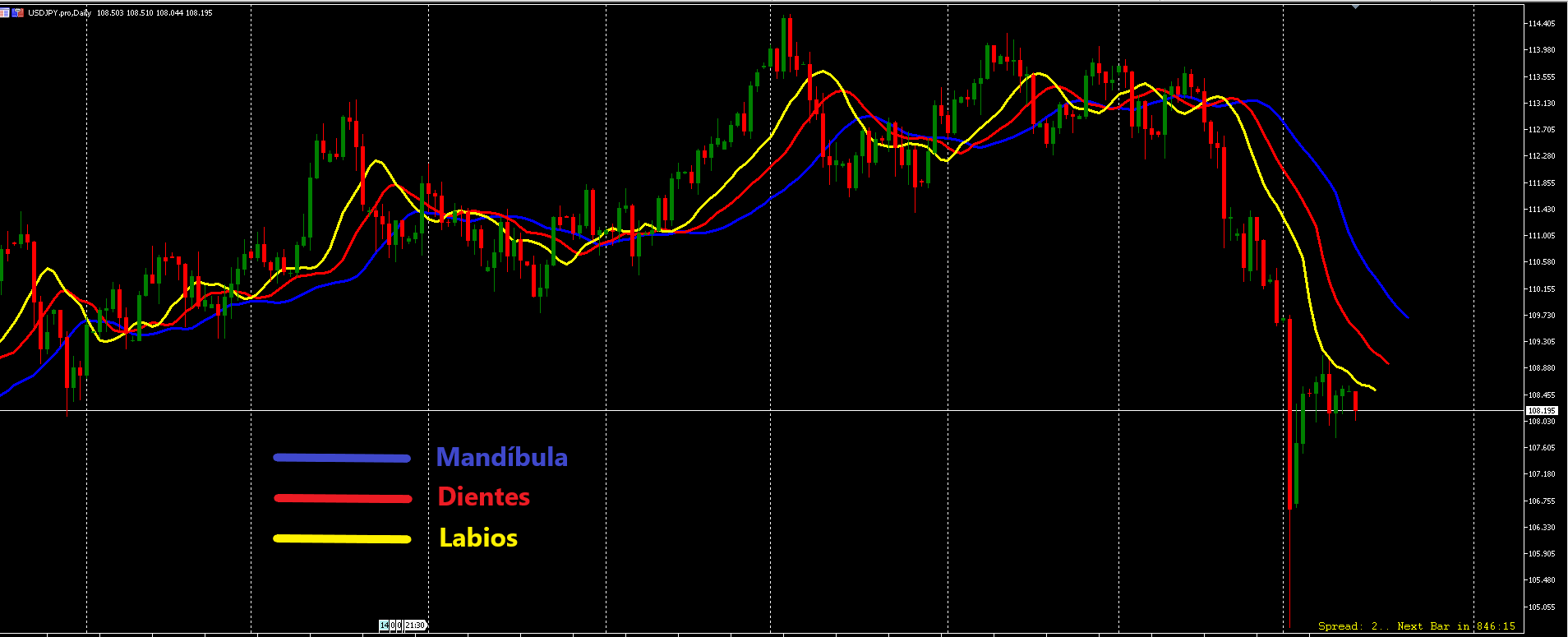 Una línea verde (Labios del Alligator), que en mi caso he configurado de amarillo para distinguir en los gráficos, y que se trata de una media móvil suavizada de 5 períodos, desplazada al futuro, tres barras.