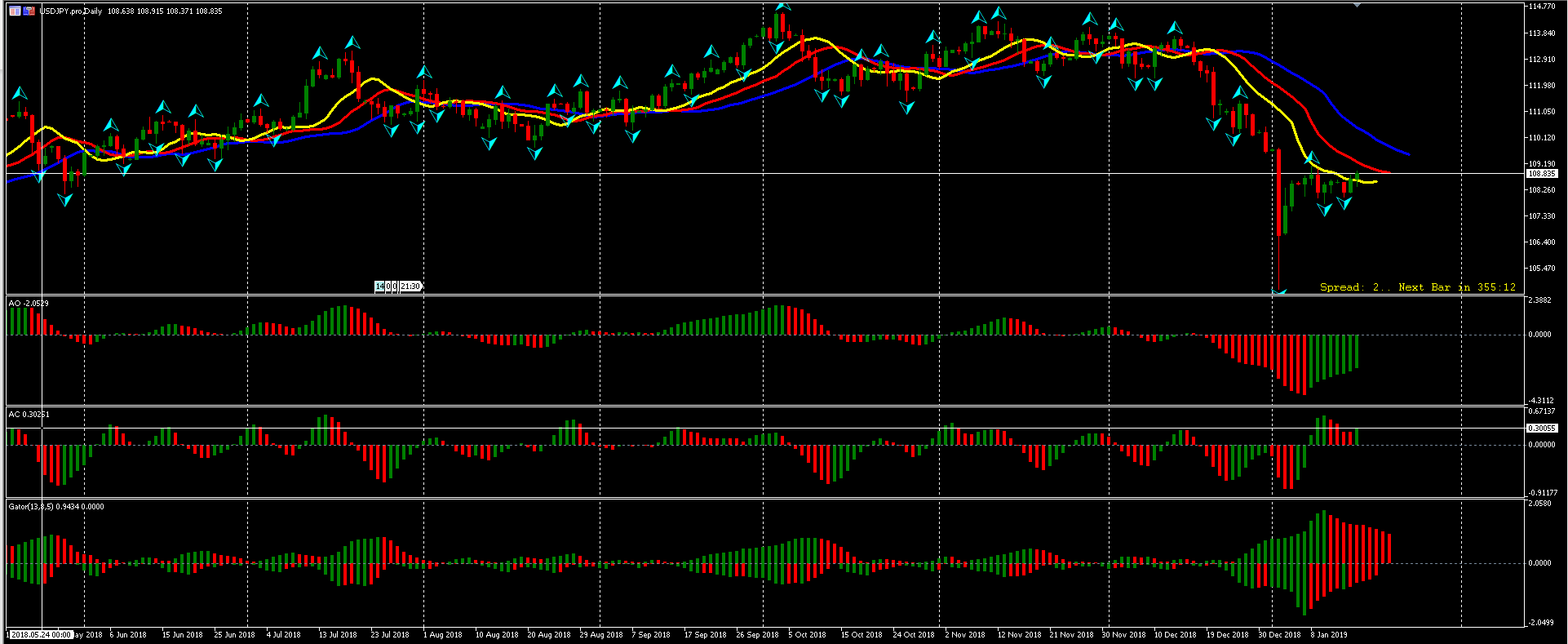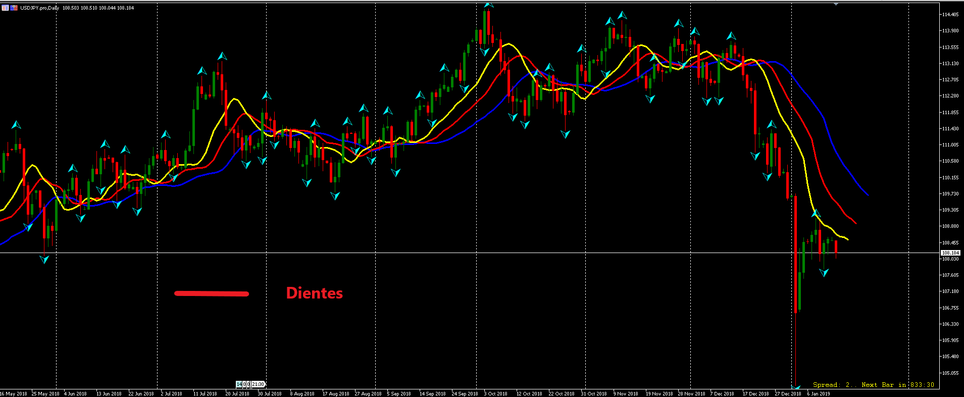 Este indicador, en la técnica de trading, se combina con el anterior, de tal forma, que el fractal, debe encontrarse fuera de la Boca del Alligator para confirmar operación y que no se realizarán compras si el fractal aparece por debajo de los Dientes del Alligator, ni ventas si el fractal aparece por encima de los Dientes del Alligator.