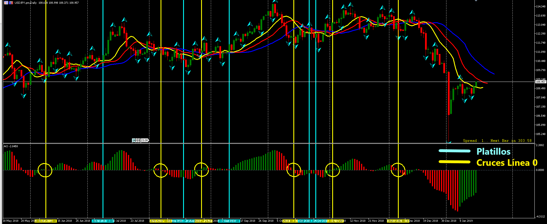 William, incorpora osciladores a su técnica, este es uno de ellos, el “oscilador asombroso” (AO), representada en forma de histograma y que construye con puntos medios de las barras calculados mediante medias móviles simples, tratando de indicarnos que sucede con la fuerza que impulsa el mercado en ese momento.