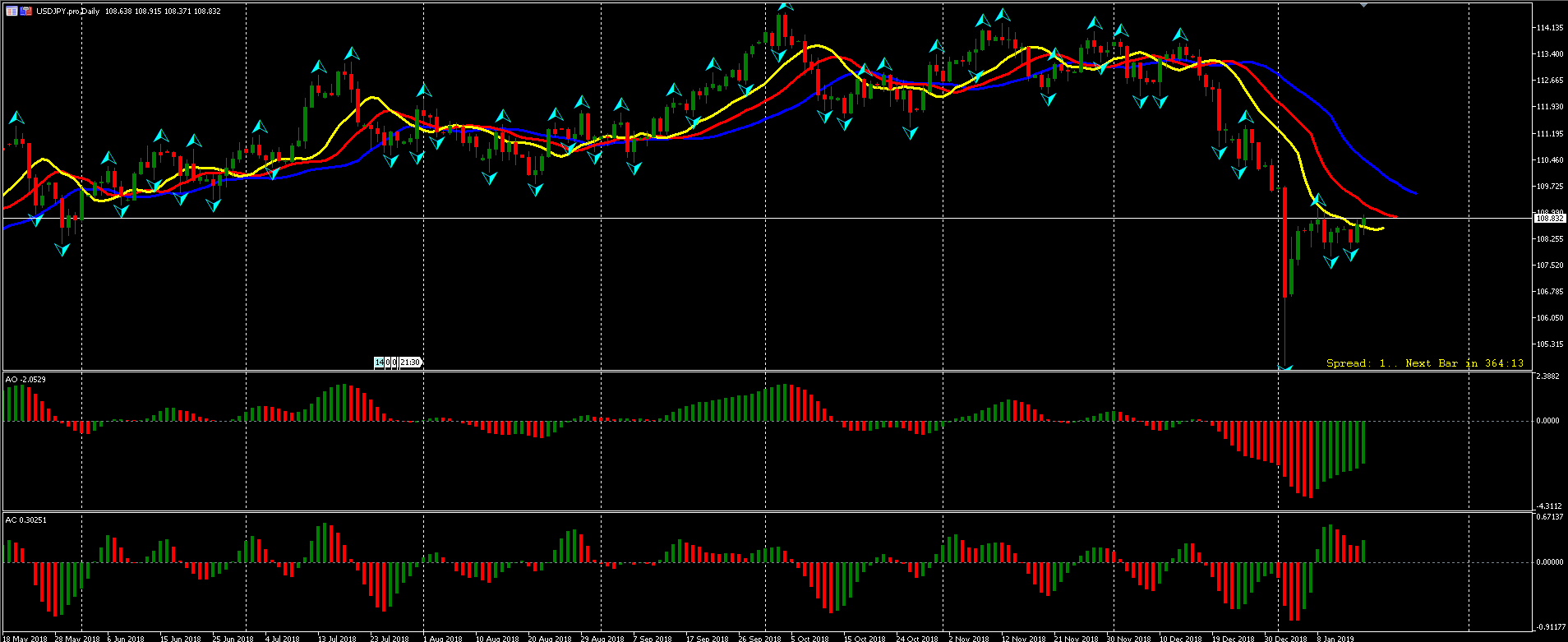 Para ello, Williams, utiliza los fractales (Fractals), determinado los máximos y los mínimos en los precios. Lo determina mediante una punta de flecha, que técnicamente, marca hacia arriba cuando el precio ha conseguido una serie de al menos cinco barras consecutivas con el mayor máximo en el medio y dos máximos menores a cada uno de sus lados. De igual forma, la punta de flecha marca hacia abajo, cuando en una serie de cinco barras, el menor mínimo se encuentra en el medio de la serie, con dos barras de mínimos mas altos a cada uno de sus lados.