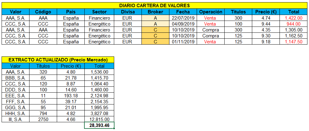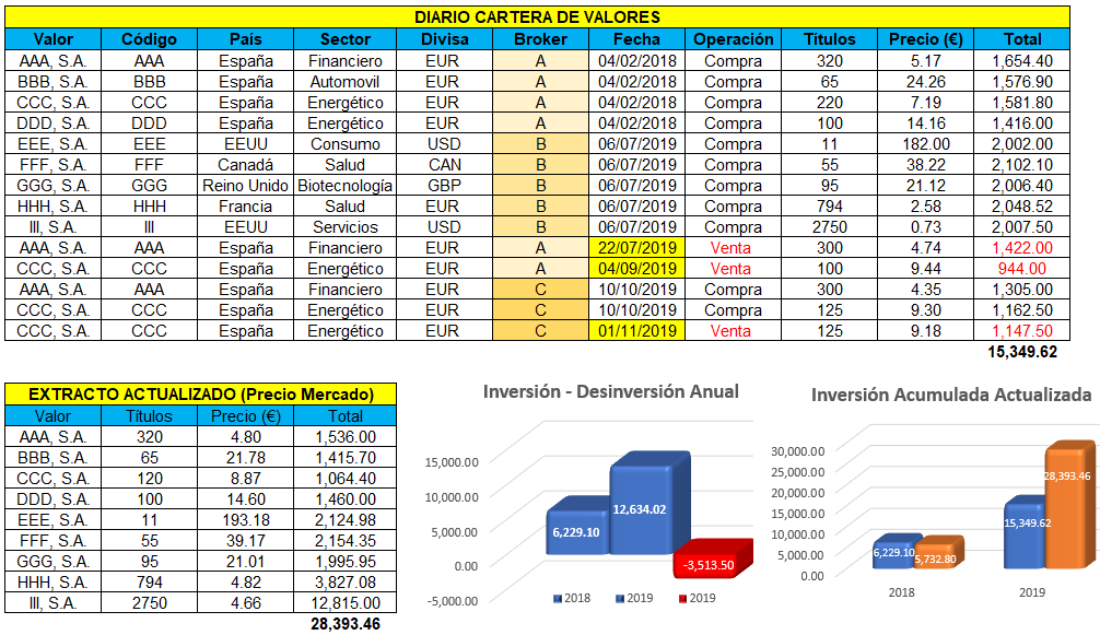 A pesar del nuevo servicio prestado por la Agencia Tributaria (Servicio de Cartera de Valores), considero conveniente llevar el propio control personalizado de nuestra cartera de valores, una especie de diario de movimientos y un extracto resumen. Estos documentos que podemos realizar mediante una sencilla hoja de cálculo, podemos desarrollarla con toda la información y complejidad que queramos (gráficos, estadísticas, ….).