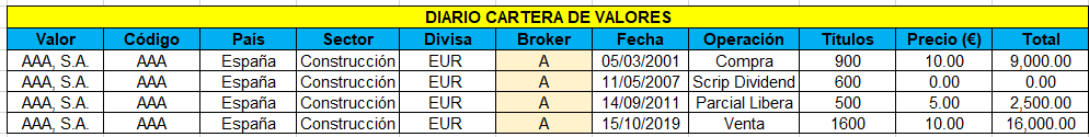 Nuestro diario de Cartera de Valores, refleja los siguientes apuntes respecto a la mercantil “AAA”, donde observamos: