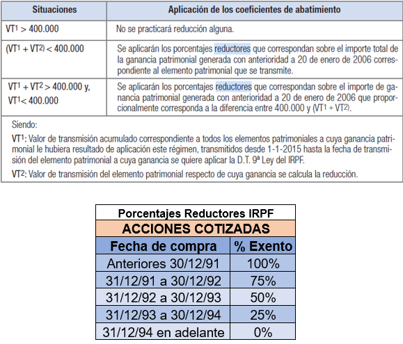 Existen ganancias patrimoniales parcialmente exentas, establecidas en un régimen transitorio, como normas heredadas de fiscalidades anteriores, es decir, los denominados coeficientes de abatimiento o reductores por transmisión.