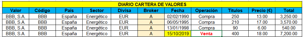 Con respecto a las acciones “BBB”, nuestro diario de cartera de valores, presenta los siguientes movimientos: