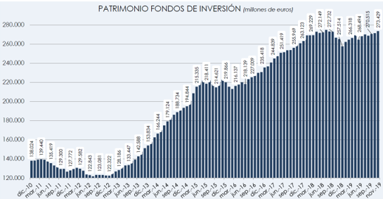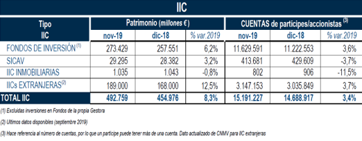 El Patrimonio de la Inversión Colectiva no ha dejado de crecer en los últimos años. Durante 2019, el volumen de activos creció hasta Noviembre un 8,3% y las cuentas de partícipes un 3,4%.
