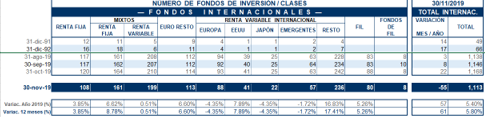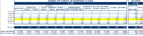 En las siguientes imágenes, para hacernos una ligera idea de la cantidad de fondos que podemos encontrar en nuestro país, en las distintas clases, al mes de Noviembre pasado, aparecían registrados un total de 2.688 FIM, de los que 1.113 eran Internacionales.