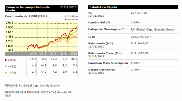 Podemos observar el comportamiento del fondo en los últimos 4 años con respecto a la categoría en la que está englobado (Renta Variable Global Capital Gran Crecimiento) y respecto a su Benchmark (Indice MSCI ACWI Growth NR USD – es un índice muy diversificado a escala mundial ponderado por capitalización bursátil).