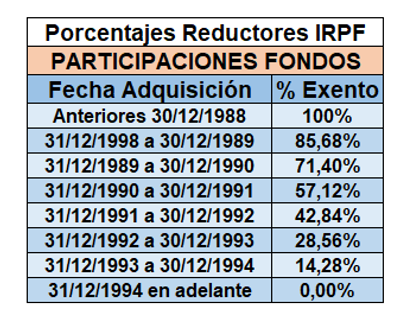 Recordad, que los coeficientes reductores solo se aplican a las ganancias obtenidas, en este caso, por la venta de participaciones en fondos de inversión, adquiridos antes del 31 de diciembre de 1994, solo, si su valor de transmisión es inferior al valor que tuvieran a efectos del Impuesto sobre el Patrimonio del año 2005, o lo que es igual, a su valor liquidativo a fecha 31 de diciembre de 2005. Si no, los coeficientes se aplican a la parte de la ganancia generada antes del 20 de enero de 2006. Este dato nos lo debe proporcionar la gestora, pero como inversores, debemos conocerlo.