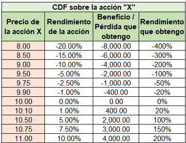 Creo que la acción cotizada “X” está infravalorada y que su precio aumentará, por lo que decido adquirir 4000 CFD’s de la acción “X”, a un precio de 10€. cada CFD. Esto sería una posición larga de 40.000 € (4.000 x 10). Supongamos que el margen exigido por mi entidad es del 5%, por lo que mi pago inicial sería de 2.000 € (5% de 40.000), un apalancamiento de 20. La rentabilidad de mi inversión dependerá del precio al que cotice la acción de “X” al vencimiento del CFD, cuyos datos he reflejo en el siguiente cuadro: