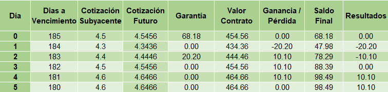 La cotización del futuro la he calculado con la fórmula que conocemos del cálculo del precio teórico, aunque este dato nos lo dará diariamente nuestro bróker. El segundo día debemos incrementar las garantías para cubrir la bajada de la cotización. Vemos que el quinto día tenemos unos resultados positivos de 10,10€ y decidimos cerrar la posición: