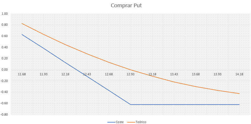 Observamos que para precios superiores a la cotización actual (12,93€), siempre perderíamos la prima pagada (0,56€ por cada acción), mientras que precios entre 12,93€ y 12,37€ (12,93 – 0,56), la pérdida iría disminuyendo, siendo las caídas de precio por debajo de 12,37€ cuando se obtendría verdaderamente beneficio en esta compra de opción PUT.