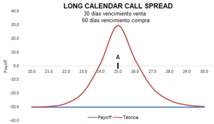 En el gráfico anterior, se observa una estrategia en la que el vencimiento de la Call vendida es a 30 días y la Call comprada es a 60 días. Indudablemente se pueden tomar otros intervalos de tiempo menores o mayores, entre ambas opciones, pero en este último caso, se requiere comprender, dominar y tener claro el funcionamiento de la asignación por ejercicio anticipado.