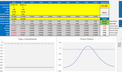 Hola Alex Go. Gracias por el apoyo y comentario. Sois varios los lectores del blog que me habéis pedido compartir la calculadora de opciones, por lo que cuando termine con los post, tengo el propósito de realizar un pequeño video explicativo para realizar una sencilla en excel. Para comenzar, lo mejor es operar en demo con dos o tres cuentas y ser muy escrupuloso con las estrategias, su análisis, seguimiento y gestión del riesgo. De todas formas, dejo uno de los enlaces que he encontrado de forma gratuita con calculadora. Un saludo. http://www.option-price.com/