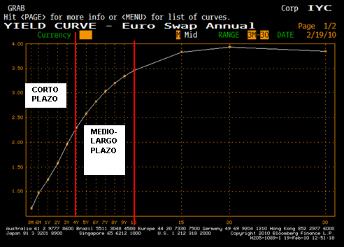 - La parte corta de la curva (2-3 años), más afectada por la política de tipos de los bancos centrales ofrece bajo potencial de rentabilidad y elevado riesgo por subidas del tipo de intervención (en el gráfico de abajo) podéis ver las rentabilidades de la curva europea). Por muy atractiva que sea la prima de riesgo (diferencial frente al swap) la rentabilidad va a ser limitada. Por ejemplo una emisión con una prima de 150 p.b. a 2 años, no daría más del 3% o cerca del 2,5% incluyendo comisiones (para un particular). Para tener una referencia de cómo están los diferenciales de crédito os diré que, un bono de Societé Generale a 2 años cotiza con un diferencial de 21 puntos básicos, por lo que su rentabilidad sería de un 1,80% menos las comisiones. Estos bonos (siempre hablando de grado de inversión) no darán más de un 2-3% en el año asumiendo riesgo de crédito. Sinceramente, creo que no interesa.