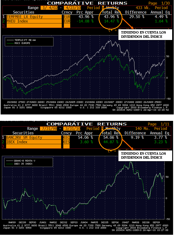 Y para terminar, dos ejemplos de que SI hay valor añadido en la gestión. En primer lugar, un clásico Franklin Mutual European, de estilo value, y en segundo lugar, me permito el lujo de incluir un fondo de inversión español (Bancaja Renta Variable), para mostrar que no toda la gestión es tan mala ni se hace tan mal en España (Bestinver a parte).