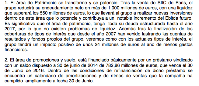 Colonial presenta una oferta no vinculante sobre realia PATRIMONIO , no sobre la compañía por unos supuestos 650 millones, con una serie de condiciones, la más importante que venda centros comerciales y activos no significativos por unos 300 millones de euros, primera pregunta como se valora realia patrimonial. Bien imaginemos que se acepta dicha propuesta, en mi primer lugar vender esos activos llevaria mucho tiempo, son activos de dificil venta, en segundo suponiendo que se vendieran y cumplieran los condicionantes, la oferta la cual es incompleta, infumable y falta de muchisima información , se interpretaría siendo literal con lo que dicen los parráfos relevantes (no llegan a hecho) , que colonial paga 650 millones por una subsidiaria de realia, la cual tienen activos por valor en libros tras la venta de la sicc de unos 1000 millones, una deuda de 834 millones y paga por ello 650 , realmente lo que propone es comprar algo que vale 700 (-300 que obliga a vender) con una deuda de 542 millones. Lo cual daría un valor a dicha operación teórica de entrada en caja para realia de millones de euros, o lo que es lo mismo una entrada en caja para realia de 400 millones de euros. Nota (1)