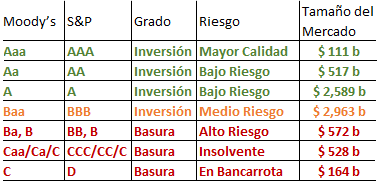 El problema con un rating de BBB se encuentra en lo que ocurre después de una rebaja en su calificación crediticia al nivel BB o inferior. En términos formales pasa a denominarse un emisor o bono sin grado de inversión, y en términos informales “bono basura”. El principal problema de los bonos basura es que hay muchos inversores institucionales que simplemente por mandato no pueden estar invertidos en ellos.