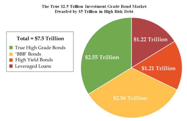 El mercado de bonos corporativos alcanzó un tamaño de $7.4 trillones en 2018, lo cual es $2.3 trillones más que en 2007. Más del 80% o $6 trillones son bonos con una calificación crediticia de grado de inversión, pero la mitad de ellos pertenecen al nivel de BBB.