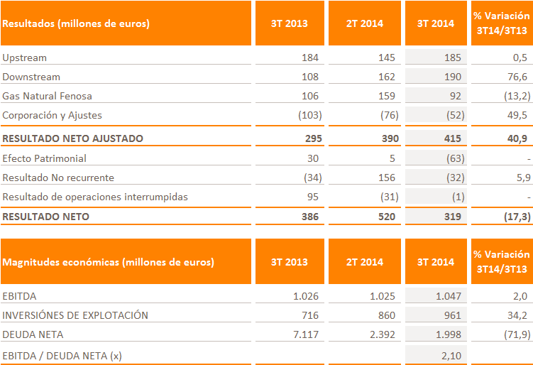 Los datos más importantes de los resultados del 3T y su comparación con el trimestre pasado y el 3T del 2013 se pueden encontrar en la siguiente tabla:
