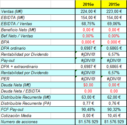 Esto traducido a cantidades reales a fecha actual supone según las cifras facilitadas unos 56-57M€ al año en 2015 y 2016, lo que significa un DPA sobre 0,685€-0,7€ y una rentabilidad sobre el precio de salida de 6,5%-6,7%.