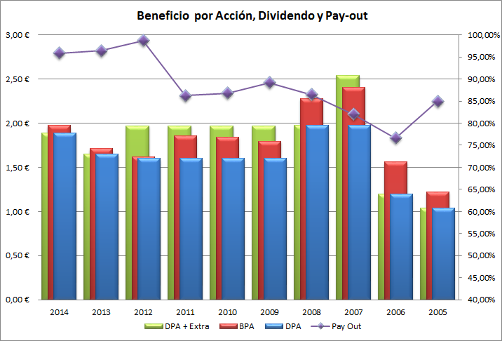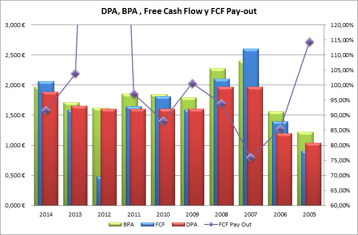 El aumento de BPA y de FCF de este año 2014 ha permitido un aumento del dividendo ordinario de 1,65€ a 1,89€ y es previsible que siga aumentando conforme lo sigan haciendo estas variables durante los próximos años.