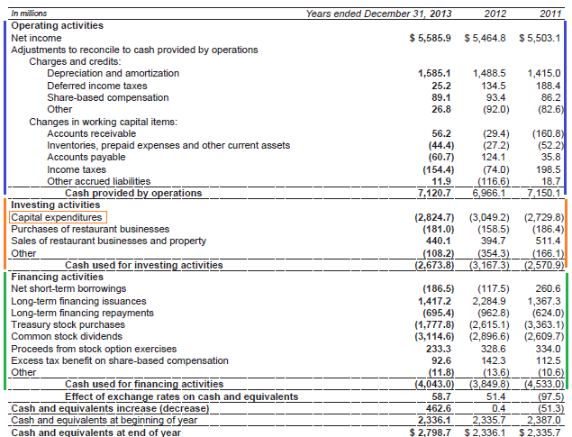 Una magnitud muy importante que se incluye en este apartado es el Capex – “Capital Expenditures” o gastos/inversiones en capital, ya que la vamos a utilizar en el cálculo del Free Cash-flow (FCF o flujo de caja libre) cuando analicemos el dinero que queda en caja para pagar dividendos. El Capex se refiere a las inversiones que se realizan, normalmente en activos productivos, tanto para mejorar/actualizar los activos (aumentar su vida útil) como para hacer crecer el negocio, por ejemplo las inversiones en modernizar una fábrica son para mantener el negocio (capex de operación), pero si se compra una fábrica nueva es una inversión para hacer crecer el negocio (capex de expansión).