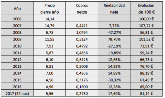 Si calculamos la rentabilidad que hubiera obtenido un accionista que hubiese comprado acciones en diciembre de 2006 a 14,14 €, hoy todavía acumularía una rentabilidad negativa del 20% (ver cuadro adjunto).