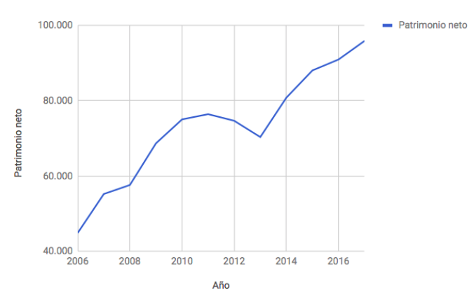De enero de 2007 a septiembre de 2017 el Banco Santander ha obtenido unos beneficios netos atribuidos de 70.369 millones de euros, una cifra exorbitante. En el mismo período, el patrimonio neto de la entidad ha pasado de los 44.851 millones de euros de diciembre de 2006 a los 95.899 millones de euros de septiembre de 2017, un incremento del 114%.