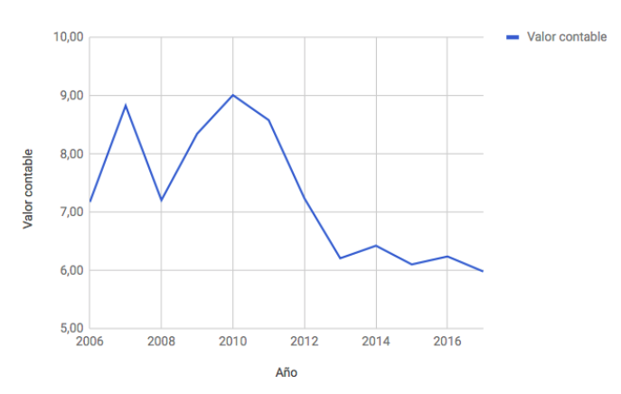 Cuando una empresa aumenta sus recursos propios, incrementa también su nivel de beneficios ya que dispone de más recursos para invertir. Sin embargo, no es eso lo que ha ocurrido en el caso del banco. El nivel absoluto de beneficios de 2016 fue un 18% inferior al de 2006. Pero peor le ha ido al accionista ya que el beneficio por acción ha pasado de ser de 1,21 € en 2006 a 0,41 € en 2016, una caída del 66%.