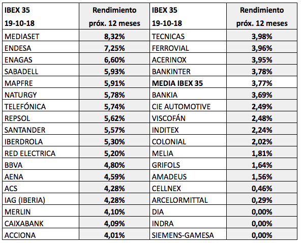 El valor con mayor rendimiento es Mediaset, que ya supera el 8%, suponiendo que en abril de 2019 pague un dividendo ordinario similar al de 2018, que fue de 0,5029 € (además pagó un extraordinario de 0,10026 €). Le sigue Endesa, con un dividendo estimado de 1,33 €, frente a los 1,382 € abonados a cargo de 2017, lo que da un rendimiento del 7,25%. El rendimiento de Inditex no incluye el extraordinario de 0,21 € a abonar el 31 de octubre junto con el ordinario complementario de 0,165 €. En realidad, Inditex viene abonando un dividendo extra cada año, por lo que si se considera la remuneración total de 0,75 €, el rendimiento es del 3,08% en vez del 2,24% indicado en la tabla.