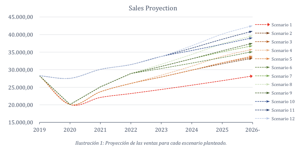 Las ventas y el FCFE de los años posteriores se han obtenido aplicando unos crecimientos interanuales distintos para cada escenario.