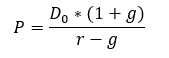 Donde P es el precio, D0 es el último dividendo, r es la tasa de descuento y g es la tasa de crecimiento de los dividendos.