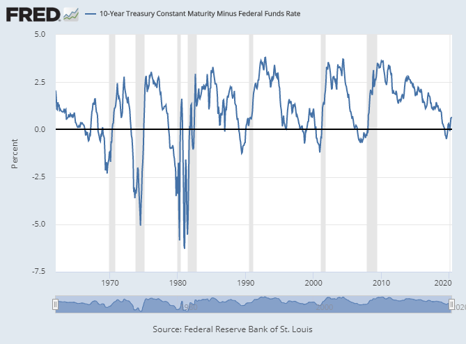 Podréis apreciar que en el gráfico no aparece la recesión en la que actualmente nos vemos inmiscuidos, pero sí se ve la inversión de la curva que sucedió en primer lugar el 28 de marzo de 2019. Si definimos el comienzo de recesión técnica como el segundo trimestre consecutivo en el que se produce una disminución del PIB, oficialmente EEUU entró en recesión el 1 de Julio de 2020, es decir, aproximadamente 15 meses después de la inversión de la curva de tipos.