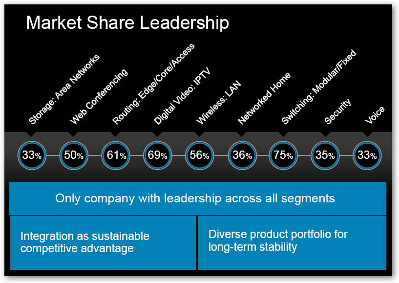 Cisco Systems (CSCO) es la principal compañía del mundo en el negocio de la conectividad y servicios relacionados. Obtiene la mayoría de sus ventas de productos como routers y switches que posibilitan que empresas y familias se comuniquen a través de la Internet, además del armado de redes privadas e inalámbricas para acceso a impresoras y discos rígidos externos, entre otros.