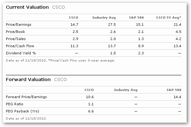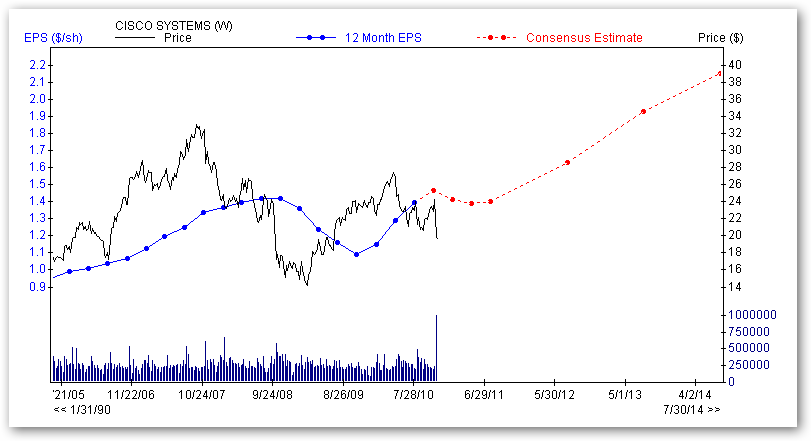 Según diferentes estimados de ganancias y valuación, considero que el valor intrínseco de Cisco (CSCO) se encuentra entre los 25 y 30 dólares por acción, pudiendo tomar como punto intermedio un promedio de 27.5 dólares. Según estos estimados, Cisco tiene un elevado potencial de revalorización frente al precio actual que se encuentra por debajo de los 20 dólares.