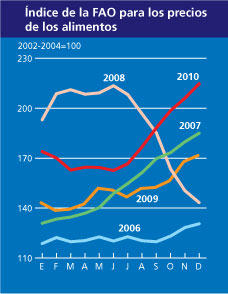 En esta nota de finales de Octubre 2010 mencionábamos que los precios de los alimentos en todo el mundo se estaban acercando peligrosamente a los máximos del 2008, año en el cual se produjo toda una serie de problemas graves por este asunto del alza en los precios de los alimentos. Varios países, entre ellos India si no me equivoco, prohibieron la exportación de ciertos productos alimenticios para tratar de garantizar el abastecimiento interno de su población. En muchos países se produjeron violentas protestas y recuerdo que se hablaba a diario de los problemas de hambruna que estaba generando la suba en los precios de los alimentos.