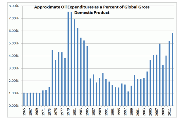 La subida de los precios de la energía no es baladí, observen en la gráfica siguiente el historial de evolución del porcentaje de gasto en crudo sobre el PIB global, ha alcanzado niveles desconocidos desde 1981.