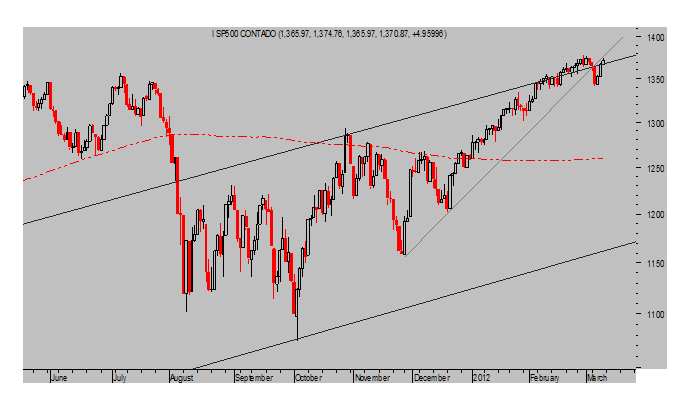 Los mercados consiguieron recobrar fortaleza, una vez más, en las últimas sesiones de la pasada semana, recuperando prácticamente todo el tramo de ligeras caídas de sesiones anteriores. El SP500 ha regresado a los 1.370 puntos, Nasdaq prácticamente a los 3.000 y Dow 12.922 puntos. Fortaleza sin convicción y bajos volúmenes de contratación, inferiores a los registrados en las sesiones de caídas previas, una vez más también.