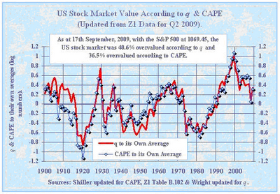 Right now, Smithers' indicators show the stock market is more than 40% overvalued. (At the most recent data point – September 17, 2009, when the S&P was at 1,069 – q showed the market was 41% overvalued and CAPE showed the market was 37% overvalued.)