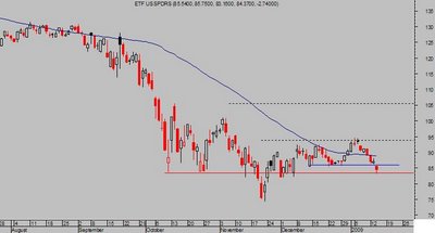 Como se aprecia en el gráfico, los mínimos de diciembre han sido perdidos (línea horizontal azul) pero la caída se detuvo en la zona crítica de soporte (roja). Si se pierde con claridad entonces puede concitar a muchos inversores a vender agresivamente. De hecho muchos Hedge Funds ya han abierto cortos en el entorno 850.