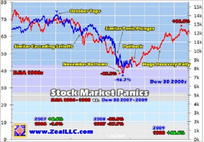 La coyuntura es muy interesante pero induce a adoptar posturas encontradas. Ejemplo de ello es el estudio realizado por Adam Hamilton, analista de mercados concienzudo en observar las similitudes de los movimientos entre el mercado de hoy y el mercado durante la crisis de 1.907, quien frente al pesimista consenso espera un comportamiento del mercado excepcional para 2.009. Sorprendente, vean en rojo el desarrollo del Dow Jones en 1.907 y en azul en 2.008: (pueden leer el informe completo en http://www.zealllc.com/2009/pstpanic.htm).