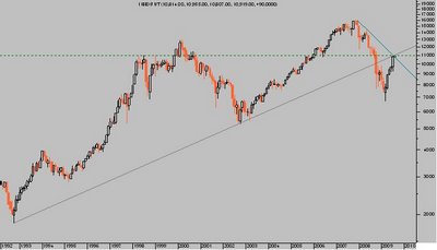 En el gráfico se observa una línea horizontal relevante desde el año 1.998 –verde discontinua- que coincide en precio con la directriz de la tendencia bajista del mercado –verde continua- iniciada en noviembre de 2.007. Además, el índice asciende en busca de la directriz de tendencia alcista –gris- perdida el pasado mes de octubre y ante la posibilidad de realizar un pull-back de medio plazo, es decir a testear la directriz y rebotar a la baja . Bien, todas las referencias confluyen en las inmediaciones de los 11.000 puntos y constituyen un área de difícil resistencia para el mercado. La probabilidad de superar esa cota de manera sostenida en esta ocasión es baja.