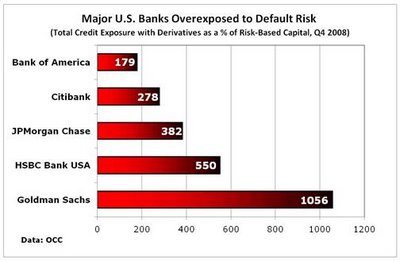 Problemas por todos los flancos pero básicamente por el crecimiento de la morosidad, amenazada por el aumento vertiginoso del paro, y por la caída del negocio básico bancario. Además existen otros pendientes de solucionar, como los derivados de las operaciones financieras vinculadas al sector inmobiliario no residencial, tarjetas de crédito, credit default swaps y derivados en general. El mercado de derivados originó unas pérdidas en la banca comercial, según datos de Office of the Comptroller of the Currency -OCC- , de $3.4 billones sólo en derivados sobre tipos de interés durante el cuarto trimestre de 2.008 (los tipos de interés suponen un 82% del total de derivados y el verdadero riesgo es la propia y masiva concentración del riesgo en un mercado donde el 96% está controlado por sólo cinco grandes bancos).