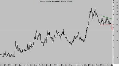 Los índices de volatilidad del SP500 y Nasdaq, VIX y VXN respectivamente, pueden ayudarnos a vislumbrar la dirección del próximo movimiento. De momento no ofrecen señales confirmadas aunque se aprecia una figura técnica proclive a romper a la baja.