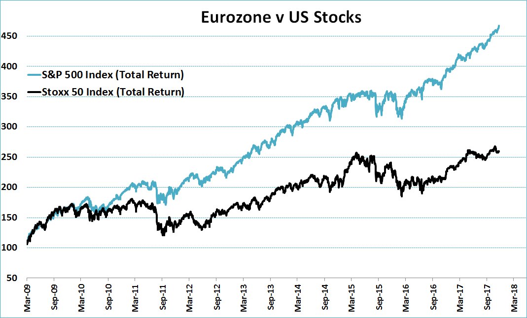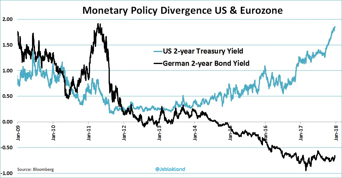 La situación esperada para los mercados europeos en 2018 es también de gran interés, observen los siguientes cuadros comparativos entre USA y Europa, en términos de política monetaria
