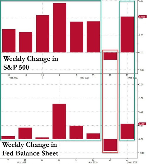 En septiembre saltó el problema a los medios, la FED respondió con una inyección de emergencia de $128.000 millones. En octubre la crisis no había cesado, la FED inyectó alrededor de $115.000 millones más y creó el programa No-QE por otros $60.000 al mes. En noviembre más liquidez, casi $100.000 millones. Ahora en diciembre se acerca el final de año y la FED se está empleando a fondo mientras trata de disimular el mar de fondo.