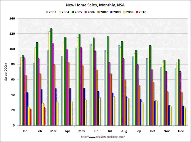 Según el Census Bureau, la venta de viviendas ha registrado un nuevo mínimo en febrero. Los programas de ayuda a la compra de vivienda deben estar favoreciendo la demanda pero aún así las ventas no mejoran, probablemente las compras de viviendas que se produjeron al calor del programa anticiparon demanda y por ello ahora flaquea. Lo normal es que este programa de ayudas será ampliado. El clima, mucho frío y nieve, ha debido también restar demanda pero el caso es que el panorama del sector es desolador. El siguiente gráfico muestra la evolución comparada de ventas de nueva vivienda.