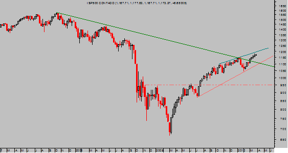 Las subidas iniciadas en febrero parecen no tener fin a pesar de la falta de participación. Las correcciones son muy controladas y poco profundas, para a continuación regresar a máximos. Se ha producido un cierre de posiciones cortas sobre el SP500 masivo y uno de los mayores de la historia, lo que puede estar avisando de que las instituciones no quieren la parte corta del mercado. O quizá es sólo que técnicamente, se han superado ciertos niveles técnicos, la zona de los 1150 puntos de SP500, que han forzado a cerrar. También aparecen noticias de que, en días pasados, UBS ha comprado nada menos que 1000 contratos de futuros sobre el índice.