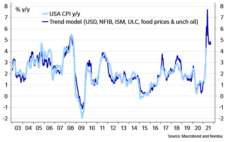 Las expectativas que manejan los mercados ya presentan un escenario de presiones intensas, algunos modelos proyectan incluso un empujón del IPC en próximos meses que podría catapultar los precios hacia el 8%, vean estimaciones elaboradas por analistas de Nordea:
